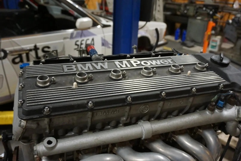 This S38B35 inline-six and Getrag 265 5-speed manual gearbox were removed from a 1985 BMW M635CSi race car acquired in 2017. The gearbox is a Metric Mechanic-built “Ultimate” Getrag 265, and the engine was reportedly built in the early 1990s by Ken Adair of The Power Plant. It was rebuilt in 2008 and 2012, after which the previous owner is said to have retired from racing. Modifications include an increased displacement of 4.0L, Schrick 272 camshafts, European-spec exhaust headers, and more.